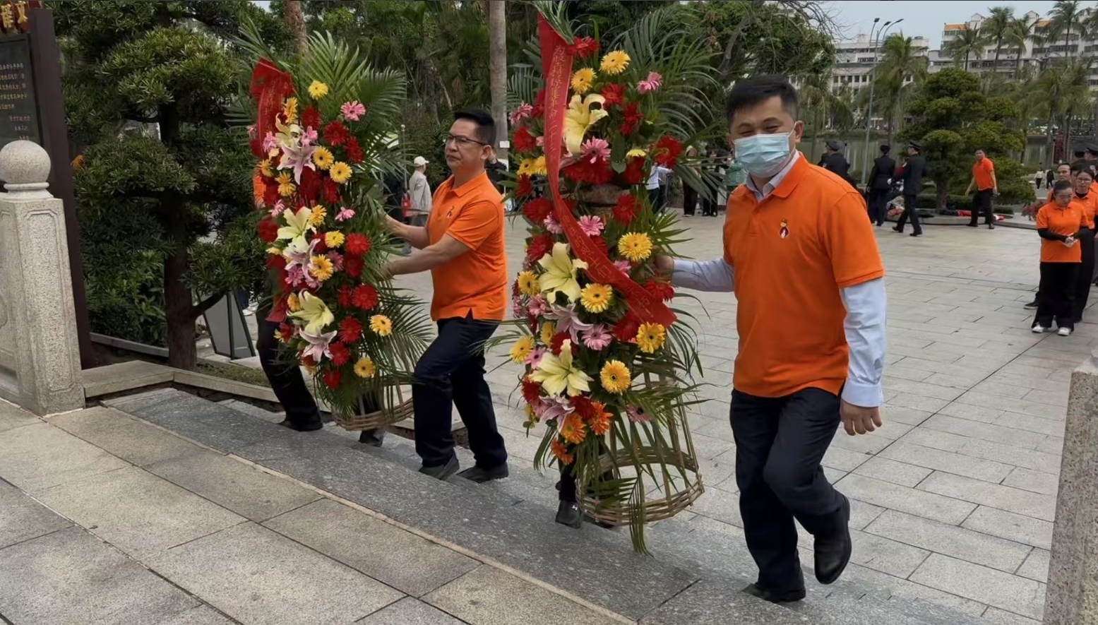 经过一段时间的等待才轮到PG。PG首先向烈士敬献花篮,花篮缎带上写着“为坚持琼崖革命23年红旗不倒牺牲的烈士们永垂不朽!”“为解放海南岛渡海牺牲的烈士们永垂不朽!”鲜艳的花篮寄托PG对革命先辈的崇敬和哀思。